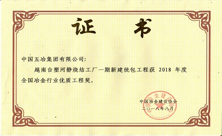 越南臺(tái)塑河靜燒結(jié)工廠一期新建統(tǒng)包工程——2018年全國(guó)冶金行業(yè)優(yōu)質(zhì)工程獎(jiǎng)