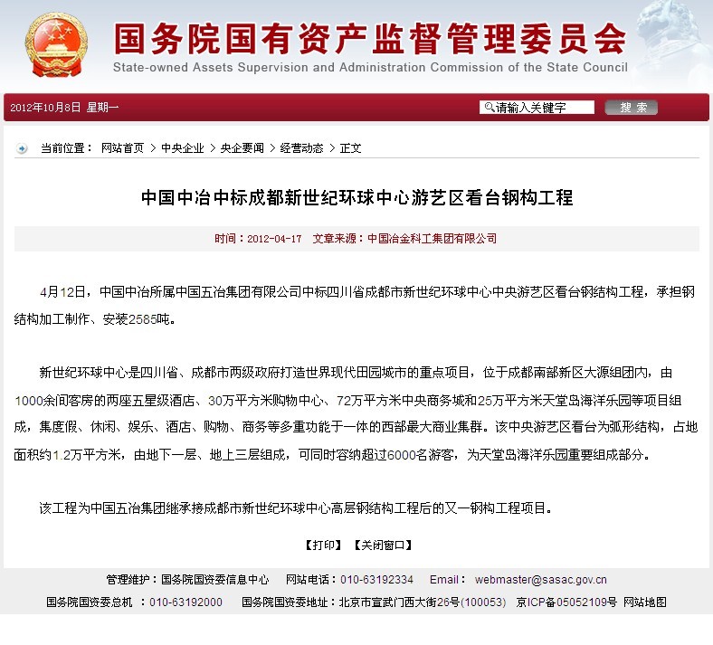 國資委網站報道:中國五冶集團中標成都新世紀環(huán)球中心游藝區(qū)看臺鋼構工程