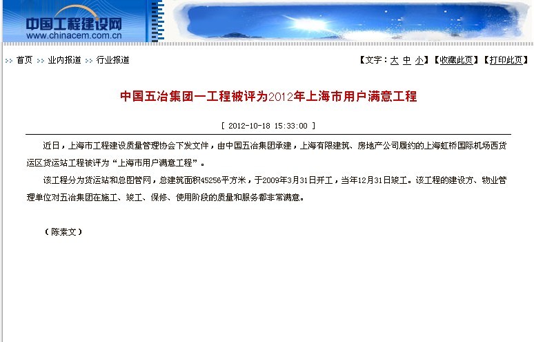 中國工程建設(shè)網(wǎng)報道:中國五冶集團(tuán)一工程被評為2012年上海市用戶滿意工程