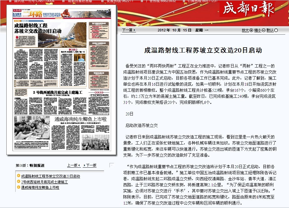成都日?qǐng)?bào)報(bào)道:成溫路射線工程蘇坡立交改造20日啟動(dòng)