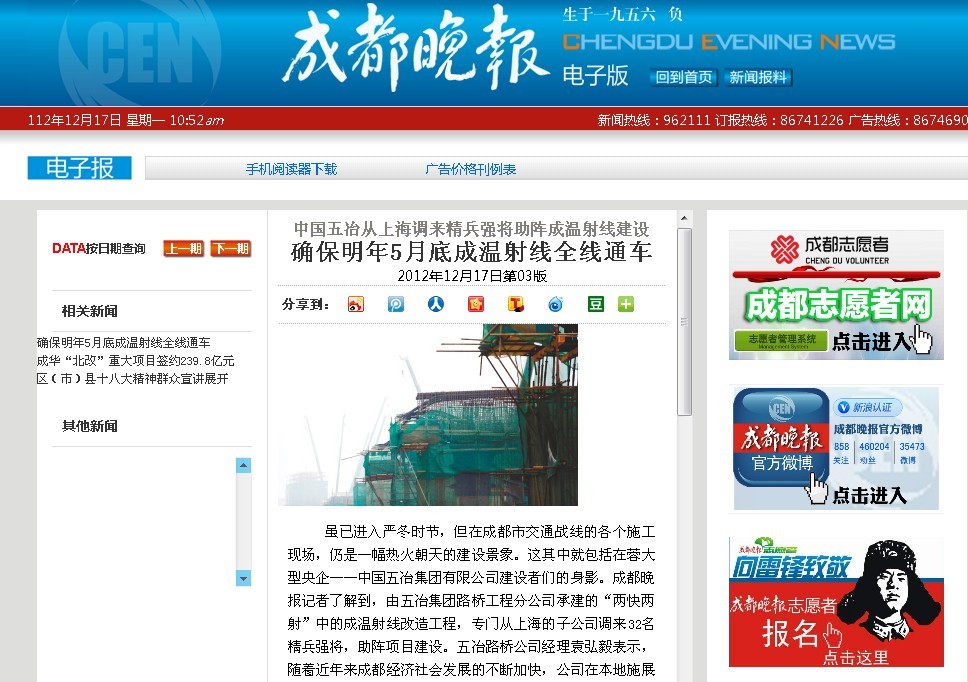 雖已進入嚴冬時節(jié),但在成都市交通戰(zhàn)線的各個施工現(xiàn)場,仍是一幅熱火朝天的建設(shè)景象。這其中就包括在 蓉大型央企——中國五冶集團有限公司建設(shè)者們的身影。成都晚報記者了解到,由五冶集團路橋工程分公司承建的“兩快兩射”中的成溫射線改造工程,專門從上海 的子公司調(diào)來32名精兵強將,助陣項目建設(shè)。五冶路橋公司經(jīng)理袁弘毅表示,隨著近年來成都經(jīng)濟社會發(fā)展的不斷加快,公司在本地施展拳腳的空間也越來越大, “我們有信心,為家鄉(xiāng)的建設(shè)不斷添磚加瓦?!?/p>