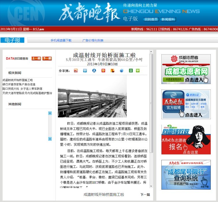 昨日,成都晚報(bào)記者從成溫路改造工程項(xiàng)目部獲悉,成溫射線主體工程已完成大半,現(xiàn)已全面進(jìn)入底層道路、橋面及防撞墻施工。按照計(jì)劃,成溫路改造工程將于5月30日完工通車(chē)。屆時(shí),建成后的成溫路車(chē)速將由現(xiàn)有的20公里/小時(shí)提高到60公里/小時(shí),實(shí)現(xiàn)城西方向的快速出城。
