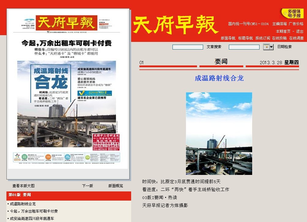 成都“兩快兩射”中的成溫路射線全線高架合龍,項(xiàng)目業(yè)主單位興城集團(tuán)和施工方負(fù)責(zé)人昨日表示,接下來(lái)將進(jìn)行高架橋防撞墻、路燈、橋面鋪裝以及交安設(shè)施的施工。本月底完成除青羊大道路段的全部防撞墻施工,4月1日開始高架橋橋面防腐以及油面鋪裝。