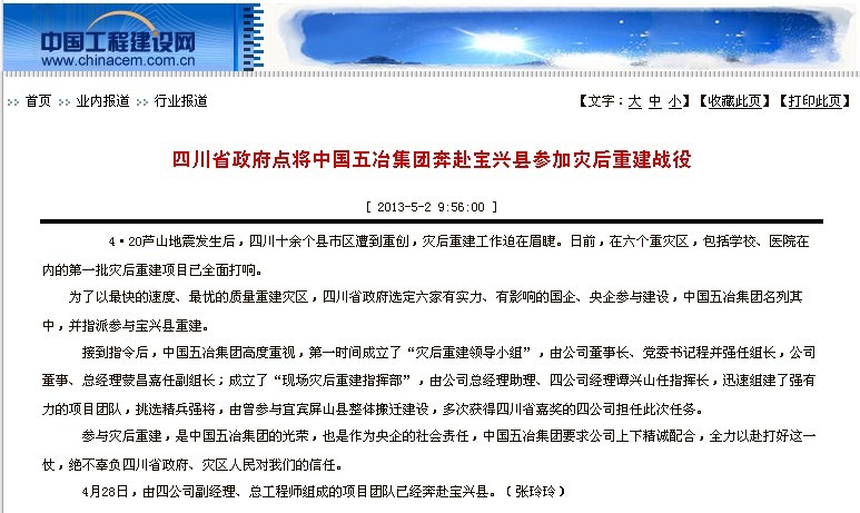 中國工程建設(shè)網(wǎng)報道:四川省政府點(diǎn)將中國五冶集團(tuán)奔赴寶興縣參加災(zāi)后重建戰(zhàn)役