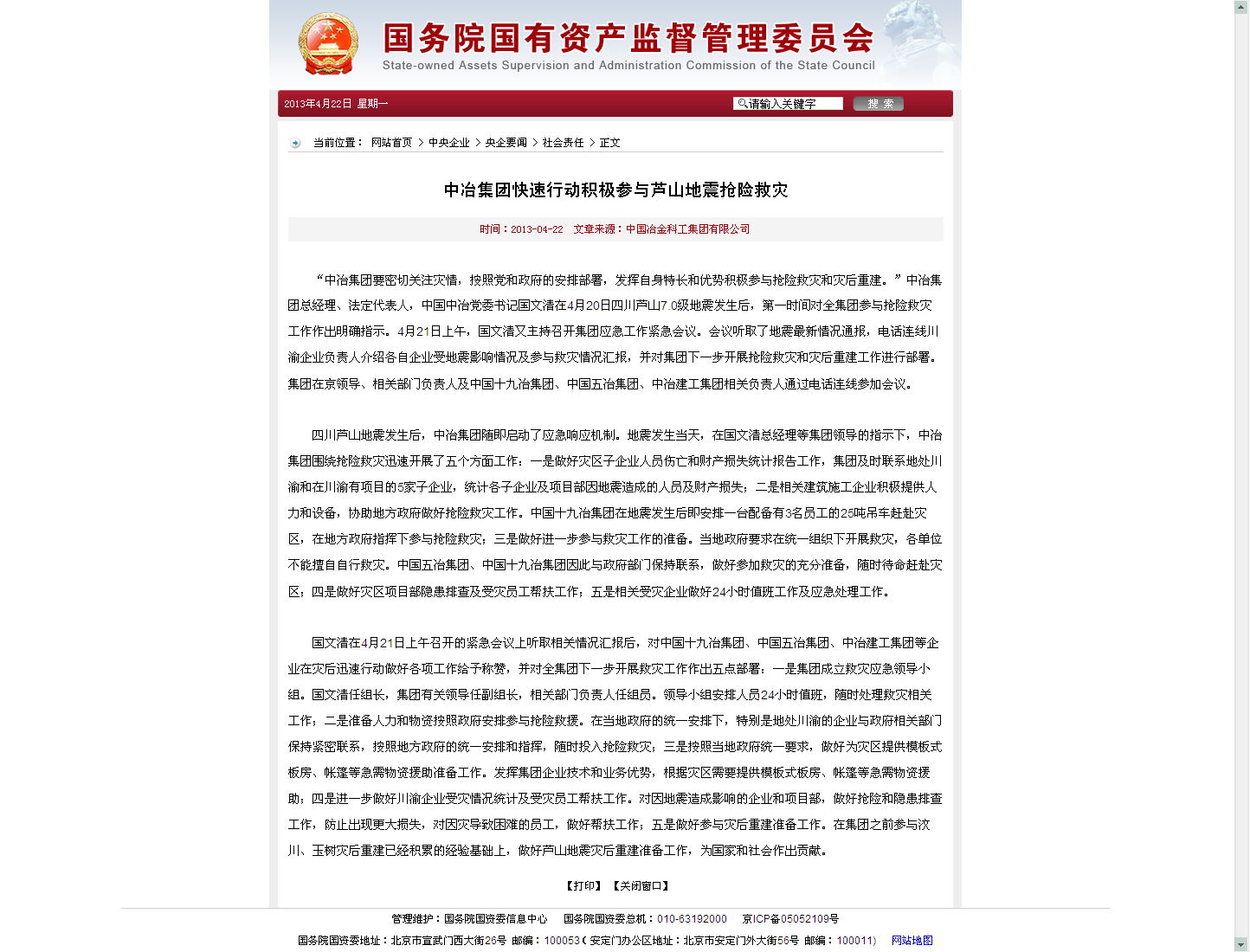 四川蘆山地震發(fā)生后,中冶集團隨即啟動了應(yīng)急響應(yīng)機制。地震發(fā)生當(dāng)天,在國文清總經(jīng)理等集團領(lǐng)導(dǎo)的指示下,中冶集團圍繞搶險救災(zāi)迅速開展了五個方面工作:一是做好災(zāi)區(qū)子企業(yè)人員傷亡和財產(chǎn)損失統(tǒng)計報告工作,集團及時聯(lián)系地處川渝和在川渝有項目的5家子企業(yè),統(tǒng)計各子企業(yè)及項目部因地震造成的人員及財產(chǎn)損失;二是相關(guān)建筑施工企業(yè)積極提供人力和設(shè)備,協(xié)助地方政府做好搶險救災(zāi)工作。中國十九冶集團在地震發(fā)生后即安排一臺配備有3名員工的25噸吊車趕赴災(zāi)區(qū),在地方政府指揮下參與搶險救災(zāi);三是做好進一步參與救災(zāi)工作的準(zhǔn)備。當(dāng)?shù)卣笤诮y(tǒng)一組織下開展救災(zāi),各單位不能擅自自行救災(zāi)。中國五冶集團、中國十九冶集團因此與政府部門保持聯(lián)系,做好參加救災(zāi)的充分準(zhǔn)備,隨時待命趕赴災(zāi)區(qū);四是做好災(zāi)區(qū)項目部隱患排查及受災(zāi)員工幫扶工作;五是相關(guān)受災(zāi)企業(yè)做好24小時值班工作及應(yīng)急處理工作。