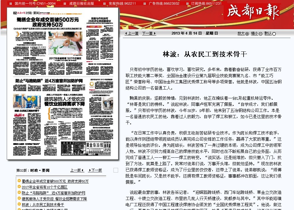 只有初中學(xué)歷的他,喜歡學(xué)習(xí),喜歡研究。多年來(lái),靠著勤奮鉆研,獲得了全市百萬(wàn)職工技能大賽二等獎(jiǎng)、全國(guó)冶金建設(shè)行業(yè)第九屆職業(yè)技能競(jìng)賽第九名、市“能工巧匠”榮譽(yù)稱號(hào)、中國(guó)冶金科工集團(tuán)優(yōu)秀焊工稱號(hào)等多項(xiàng)榮譽(yù)。他就是林波,中國(guó)五冶鋼結(jié)構(gòu)公司的一名普通工人。