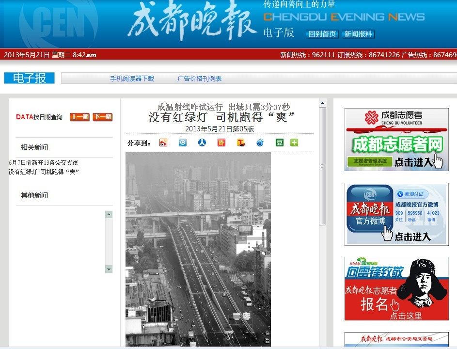 上午8時(shí)許,成溫射線正式進(jìn)入試運(yùn)行,成都晚報(bào)記者乘坐第一輛警車體驗(yàn)剛通車的成溫射線。一路上,警車按照60km/h的速度行駛,從成溫射線二環(huán)路到三環(huán)路僅僅耗時(shí)3分37秒。緊接著,警車沿著蘇坡立交下橋后往回走,盡管底層道路需要等紅燈,但回到成溫立交花了9分鐘。全程“跑一圈”共花了12分鐘。