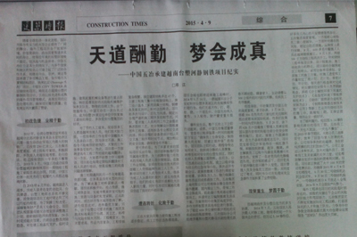 4月9日,《建筑時報》第3209期第七版頭條以《天道酬勤?夢會成真——中國五冶承建越南臺塑河靜鋼鐵項目紀實》為題,從“初戰(zhàn)告捷,業(yè)精于勤;遭遇轉(zhuǎn)折,化險于勤;涅槃重生,?夢圓于勤”三個方面,刊文報道了中國五冶集團海外項目管理中較先進和較成熟的管理模式,對中國五冶為確保項目履約質(zhì)量而配備的高效實用的應急處理機制進行了詳細梳理。