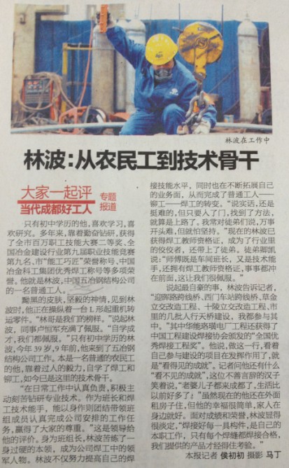 4月15日,成都市總工會(huì)聯(lián)合成都電視臺(tái)、成都廣播電臺(tái)、成都日?qǐng)?bào)、成都商報(bào)等成都市多家新聞媒體對(duì)當(dāng)代成都好工人候選人——鋼構(gòu)分公司三車間班長、焊工林波進(jìn)行了采訪,錄制了“走基層——尋訪當(dāng)代成都好工人”節(jié)目,并在成都電視臺(tái)新聞綜合頻道(CDTV—1)《新聞18點(diǎn)》欄目中進(jìn)行宣傳報(bào)道。成都商報(bào)、成都日?qǐng)?bào)等媒體進(jìn)行了專題報(bào)道。