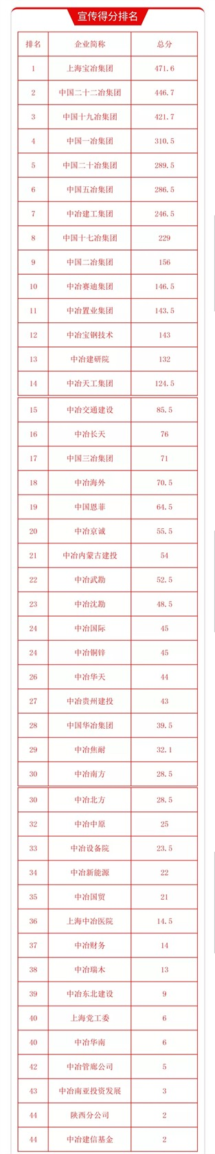 2018年上半年中冶集團宣傳得分排名