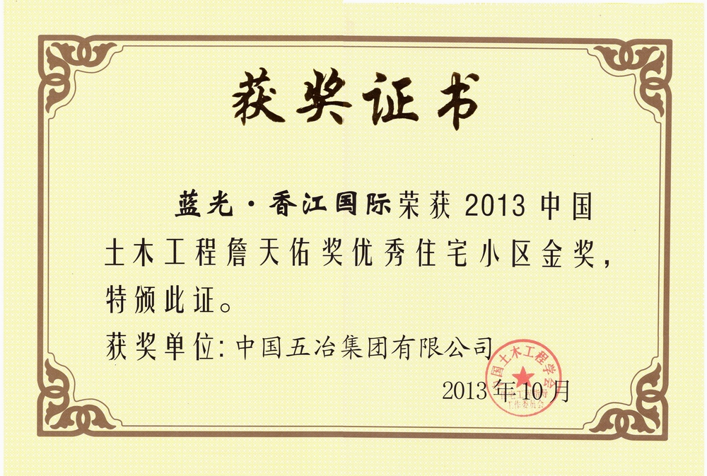 ????2013年10月,中國五冶集團(tuán)有限公司藍(lán)光·香江國際項目榮獲2013年度中國土木工程詹天佑獎優(yōu)秀住宅小區(qū)金獎。