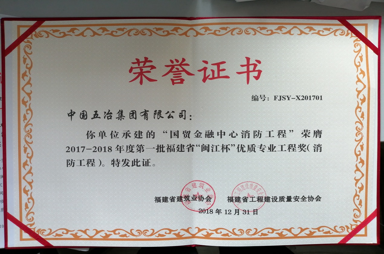 國(guó)貿(mào)金融中心消防工程榮獲2017—2018年度第一批福建省“閩江杯”優(yōu)質(zhì)專業(yè)工程獎(jiǎng)(消防工程)