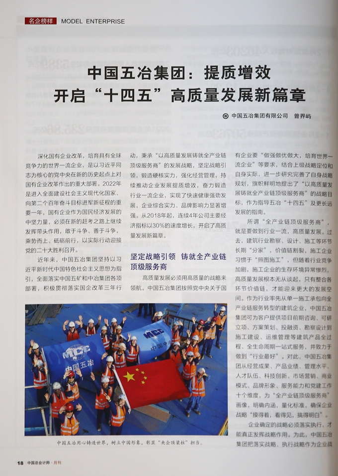 近日,由中國(guó)總會(huì)計(jì)師協(xié)會(huì)主辦的《中國(guó)總會(huì)計(jì)師》雜志在3月兩會(huì)特刊以《中國(guó)五冶集團(tuán):提質(zhì)增效 開(kāi)啟“十四五”高質(zhì)量發(fā)展新篇章》為題,大篇幅報(bào)道了中國(guó)五冶集團(tuán)在實(shí)施“十四五”規(guī)劃、開(kāi)啟全面建設(shè)社會(huì)主義現(xiàn)代化國(guó)家新征程的奠基之年,堅(jiān)定發(fā)展戰(zhàn)略,鍛造硬核實(shí)力,強(qiáng)化經(jīng)營(yíng)管理,穩(wěn)促高質(zhì)發(fā)展的生動(dòng)案例,展現(xiàn)了中國(guó)五冶作為行業(yè)標(biāo)桿的一流品牌形象。