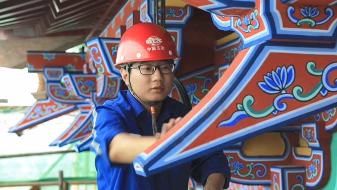 項(xiàng)目管理人員檢查仿宋代彩繪效果