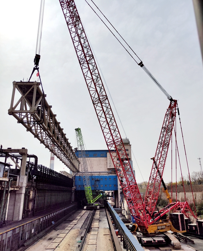 此次吊裝中的兩臺(tái)800噸履帶吊雙機(jī)抬吊焦?fàn)t大棚超重桁架長(zhǎng)距離帶負(fù)荷行走是全國(guó)首次,毫無(wú)可借鑒的經(jīng)驗(yàn)。在總部機(jī)關(guān)支撐保障和項(xiàng)目部精心組織下,兩臺(tái)大型履帶吊順利完成包括起鉤、抬吊負(fù)載行走、跨過(guò)滑觸線、空中繞桁架、起吊就位、摘鉤等多個(gè)高難度動(dòng)作,同時(shí)在兩臺(tái)汽車吊的輔助下順利完成了穿鋼絲繩、鋪路基板、增超起配重、取鋼絲繩等工作。接下來(lái),項(xiàng)目團(tuán)隊(duì)將持續(xù)科學(xué)謀劃,抓好安全生產(chǎn),搞好施工質(zhì)量,將河北華豐焦?fàn)t煙氣治理項(xiàng)目打造成經(jīng)得起考驗(yàn)的精品工程、示范工程,在業(yè)界樹(shù)立良好的豐碑,向業(yè)主交一份滿意的答卷。(趙洪浩)