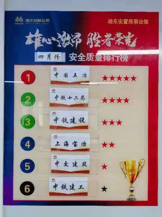 此項排名由雄安集團城市發(fā)展投資有限公司發(fā)起,以月度為周期,從安全質(zhì)量等五大維度對6家參與雄東B單元安置房項目建設(shè)的央企總包單位進行綜合考核。中國五冶集團憑借優(yōu)秀的項目管理能力和安全質(zhì)量水平,自2月份以來已連續(xù)3次榮膺履約考評第一佳績,項目4名管理人員連續(xù)2次摘得“安全質(zhì)量之星”“項目管理之星”榮譽稱號。