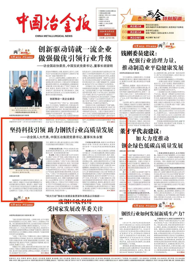 2024年全國(guó)兩會(huì)期間,全國(guó)人大代表,中國(guó)五冶集團(tuán)黨委書記、董事長(zhǎng)朱永繁接受多家權(quán)威主流媒體專訪,積極履職建言獻(xiàn)策,實(shí)事求是講述五冶高質(zhì)量發(fā)展情況。3月8日,《中國(guó)冶金報(bào)》頭版以《堅(jiān)持科技引領(lǐng) 助力鋼鐵行業(yè)高質(zhì)量發(fā)展》為題刊發(fā)對(duì)朱永繁代表的專訪報(bào)道,現(xiàn)對(duì)報(bào)道進(jìn)行全文轉(zhuǎn)發(fā)。