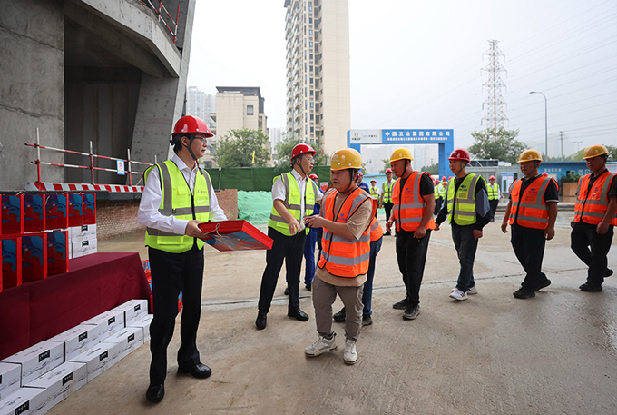 朱永繁董事長一行先后走進(jìn)錦官花城綜合體、龍泉東洪片區(qū)開發(fā)項(xiàng)目現(xiàn)場,詳細(xì)了解工程概況、工期進(jìn)度、策劃編制及執(zhí)行、履約管理等方面情況,向節(jié)日期間堅(jiān)守崗位、辛勤工作的各位員工、合作伙伴、廣大工友表示敬意和感謝,并送上月餅、牛奶、零食、生鮮等慰問品,祝福大家國慶中秋雙節(jié)快樂,叮囑大家安排好節(jié)日期間的工作和生活。