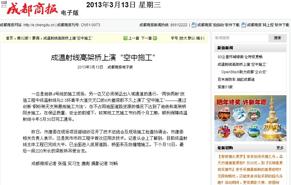 一邊是地鐵4號線的施工現(xiàn)場,另一邊又必須保證出入城通道的通行,“兩快兩射”改造工程中成溫射線與2.5環(huán)青羊大道交叉口的6片蓋梁前不久上演了“空中施工”———通過創(chuàng)新“鋼桁架無支架懸掛施工方法”,在不占用地面道路資源的情況下達到了地鐵和高架橋同步施工,在保證質(zhì)量、安全的前提下,較常規(guī)工藝施工節(jié)約兩個月工期,順利保障成溫射線今年5月30日完工通車。