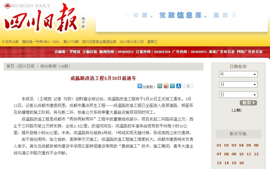 成溫路改造工程是成都市“兩快兩射兩環(huán)”工程中的重要組成部分,項目東起二環(huán)路成溫立交,西止于三環(huán)路蘇坡立交橋東側,全場2.5公里。改造完成后,成溫路的車速將由現(xiàn)有的平均每小時20公里,提升到每小時60公里。未來,成溫路將與地鐵4號線、7號線實現(xiàn)無縫對接,形成城西立體交通網(wǎng)。