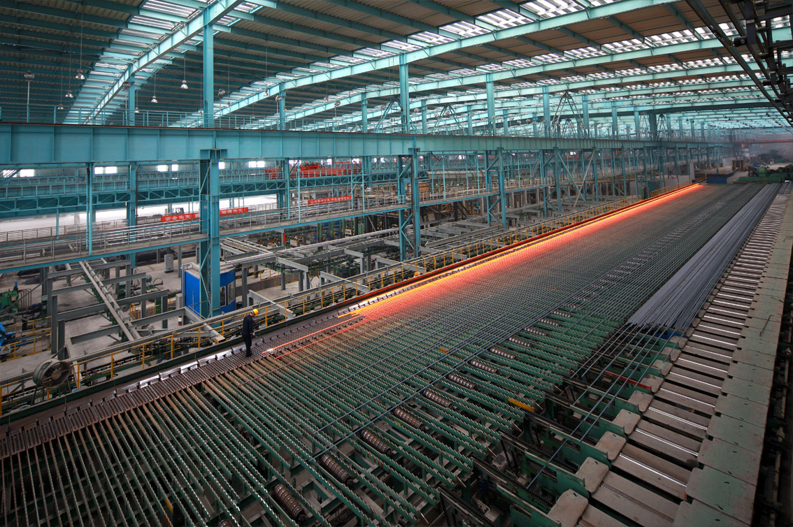 圖為威鋼高速線材生產(chǎn)線——中棒步進式冷床生產(chǎn)場景