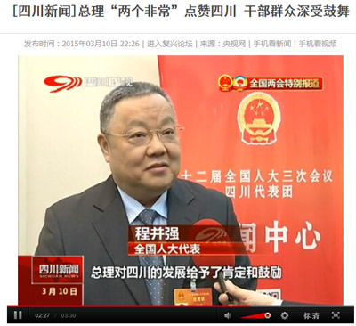 為此,四川衛(wèi)視在3月10日《四川新聞》“全國兩會(huì)特別報(bào)道”中,以“總理‘兩個(gè)非?!c(diǎn)贊四川?干部群眾深受鼓舞”為主題,對(duì)參加十二屆全國人大三次會(huì)議四川代表團(tuán)部分全國人大代表進(jìn)行了采訪,全國人大代表,中國五冶集團(tuán)董事長、黨委書記程并強(qiáng)在采訪中表示:總理對(duì)四川的發(fā)展給予了肯定和鼓勵(lì),同時(shí)也指明了一些方向,特別是通過加大基礎(chǔ)設(shè)施建設(shè)、水利建設(shè)、交通建設(shè),促進(jìn)四川發(fā)展,要求四川轉(zhuǎn)型升級(jí)方面感觸很深。”