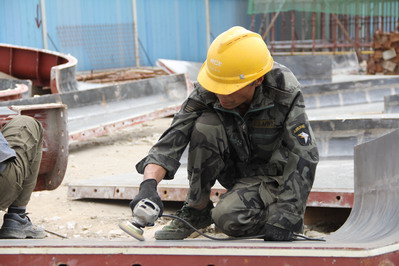 鳳凰山高架項目現(xiàn)場模版工人正在打磨墩柱模版