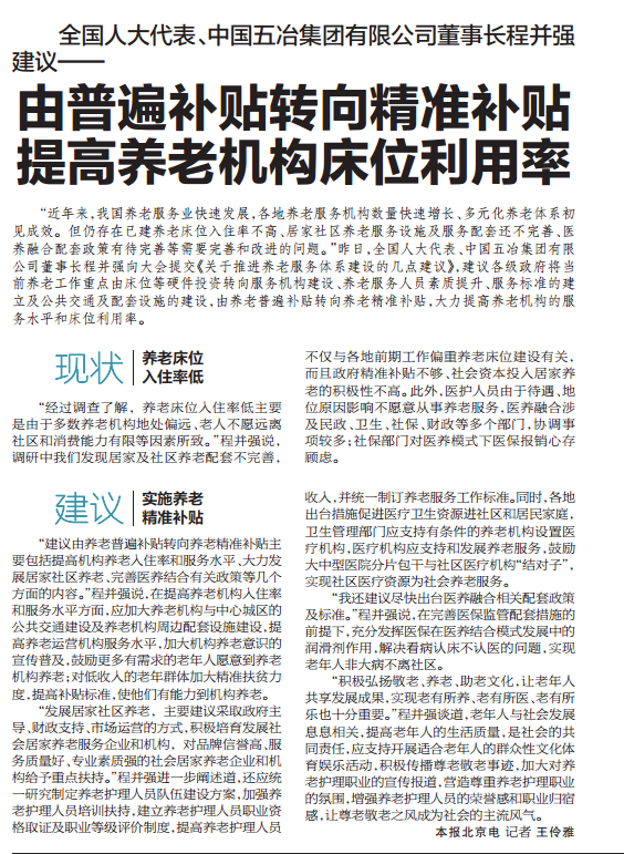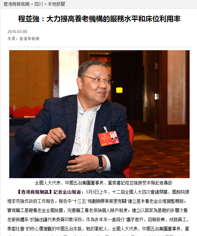 《香港商報網》記者以“大力提高養(yǎng)老機構的服務水平和床位利用率”為題,從李克強總理的工作報告中“十三五”規(guī)劃綱要草案里有關“建立基本養(yǎng)老金合理調整機制;實現職工基礎養(yǎng)老金全國統(tǒng)籌等,完善職工養(yǎng)老保險個人賬戶制度;建立以居家為基礎的多層次養(yǎng)老服務體系等”出發(fā),就如何提高養(yǎng)老機構服務水平,如何提高養(yǎng)老床位利用率等話題,對全國人大代表,中國五冶集團董事長、黨委書記程并強進行了專訪。