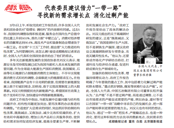 在3月7日《成都晚報(bào)》三版,“奮進(jìn)‘十三五’加快建設(shè)國際化大都市——2016年全國兩會(huì)特別報(bào)道”中,記者以“委員代表建議借力‘一帶一路’ 尋找新的需求增長點(diǎn) 消化過剩產(chǎn)能”為題,就“十三五”大力推進(jìn)結(jié)構(gòu)性改革話題對程并強(qiáng)進(jìn)行了專訪。程并強(qiáng)在專訪中指出:加強(qiáng)供給側(cè)結(jié)構(gòu)性改革,增強(qiáng)持續(xù)增長動(dòng)力,政府工作報(bào)告明確了今年要做的重點(diǎn)工作,其中包括著力化解過剩產(chǎn)能和降本增效,重點(diǎn)抓好鋼鐵、煤炭等困難行業(yè)去產(chǎn)能?!叭ギa(chǎn)能”不是不要過剩產(chǎn)能,而是通過調(diào)整,讓不適應(yīng)市場需求的產(chǎn)能變成需要的產(chǎn)能,例如冶金、建材等可以在國家“一帶一路”倡議中尋求自己的發(fā)展機(jī)會(huì),把一部分產(chǎn)能轉(zhuǎn)移到更需要的地方去。