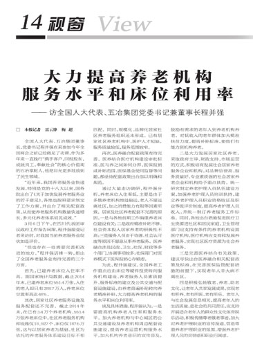 3月10日,《中國(guó)改革報(bào)》以“大力提高養(yǎng)老機(jī)構(gòu)的服務(wù)水平和床位利用率”為題,刊文報(bào)道了全國(guó)人大代表程并強(qiáng)在兩會(huì)上提交的《關(guān)于推進(jìn)養(yǎng)老服務(wù)體系建設(shè)的幾點(diǎn)建議》,記者就相關(guān)話題進(jìn)行了詳細(xì)的采訪報(bào)道。