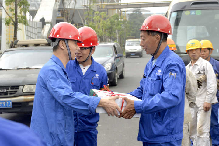 ????金秋十月,丹桂飄香,在舉國上下祝福祖國母親67歲華誕,人們沉浸在熱鬧祥和的節(jié)日氣氛中時,公司廣大工程建設者為了項目建設依然奔波在施工一線。10月1日,中國五冶集團董事長、黨委書記程并強、董事、總經理朱永繁、黨委副書記、副總經理劉偉、副總經理萬明海、副總經理譚興山及工會一行,來到成都招商中央華城和藍光雍錦閣項目現(xiàn)場,慰問奮戰(zhàn)在施工一線的廣大員工們,向他們送去豬肉、水果等節(jié)日慰問品,并與一線員工們傾心交流,為大家送上關懷和祝福。