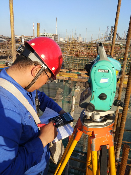 寶鋼工程公司 寶鋼一二燒結(jié)整合大修項目測量員進行現(xiàn)場螺栓定位復(fù)測