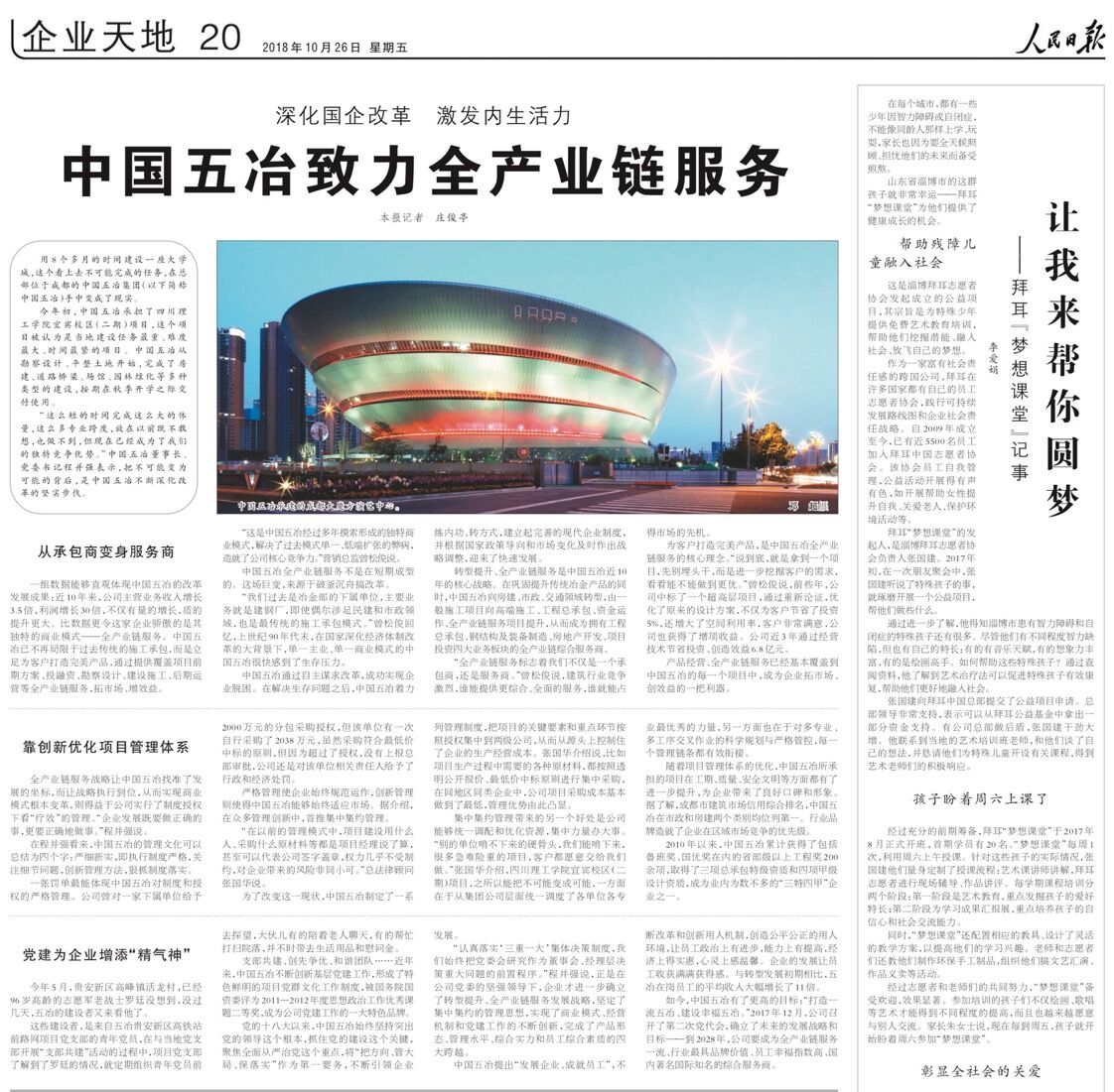 10月26日,《人民日?qǐng)?bào)》以《深化國企改革?激發(fā)內(nèi)生活力——中國五冶致力全產(chǎn)業(yè)鏈服務(wù)》為題,對(duì)中國五冶集團(tuán)深化國有企業(yè)改革的經(jīng)驗(yàn)和成績(jī)進(jìn)行了深度報(bào)道。