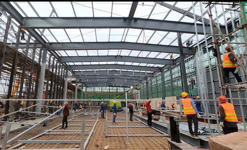 第1天,場(chǎng)地土方平整、柱基開挖、鋼結(jié)構(gòu)預(yù)埋螺栓、柱基砼澆筑完成;第2天,地坪混凝土澆筑完成;第4天,鋼結(jié)構(gòu)主體270噸吊裝完成;第5天,室內(nèi)轉(zhuǎn)換鋼架及內(nèi)外墻龍骨焊接完成,內(nèi)外裝修全面展開;第7天,2300平方米屋面彩瓦鋪設(shè)完成;第11天,幕墻全部完成;第13天,內(nèi)外裝修、PC板鋪裝、以及PC花崗石鋪裝完成……看著13天平地起高臺(tái)的速度和成績(jī),項(xiàng)目指揮長(zhǎng)王成軍激動(dòng)地說:“大家擰成一股繩,不回家、不下線、不松勁,很多管理人員甚至連續(xù)兩天不睡覺盯現(xiàn)場(chǎng),可謂一小時(shí)也不耽誤,一小時(shí)也不懈??!業(yè)主都夸我們是善打硬仗、‘無所不能’的五冶人!”