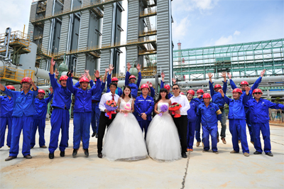 湛鋼工地領(lǐng)導(dǎo)得知這一情況后,決定就在湛鋼工地上為他們舉行一次別樣的婚禮。伴隨著湛鋼煉焦項目機器設(shè)備的轟鳴聲,湛鋼五冶分指揮部黨工委書記薛志群向兩位新人獻上了鮮花,并送上了深深的祝福,薛書記說道:“你們?yōu)檎夸摴さ氐慕ㄔO(shè)做出了貢獻,辛苦了。這次的婚禮有著特殊的意義,希望你們幸福美滿,和和睦睦,白頭到老。也希望你們能早生貴子,像咱們湛鋼工地一樣,早日結(jié)出豐碩的果實?!彪S后,在現(xiàn)場20多位工友的見證祝福下,兩對新人相互擁吻,在大家的歡呼和祝福聲中新人流下了幸福和激動的淚水。